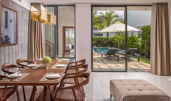 Bữa sáng hằng ngày dành cho khách lưu trú tại khối biệt thự được phục vụ riêng tại nhà hàng Indigo, tọa lạc đối diện biển, với thực đơn buffet tự chọn phong phú Á – Âu kết hợp cùng các lựa chọn gọi món cao cấp, đáp ứng đa dạng khẩu vị và nhu cầu ẩm thực của từng thành viên trong gia đình.
